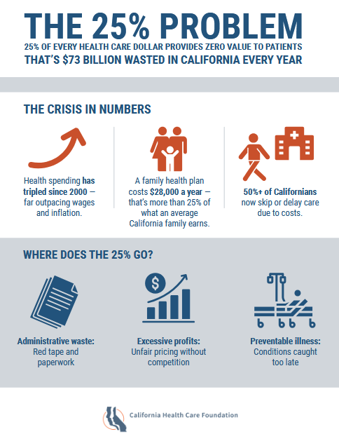 But around 25 cents of every dollar in our health care system doesn’t help patients get better care or become healthier. In 2020, it was estimated that this added up to as much as $73 billion dollars a year in California’s health care system. Where does that money go? The top three culprits are: